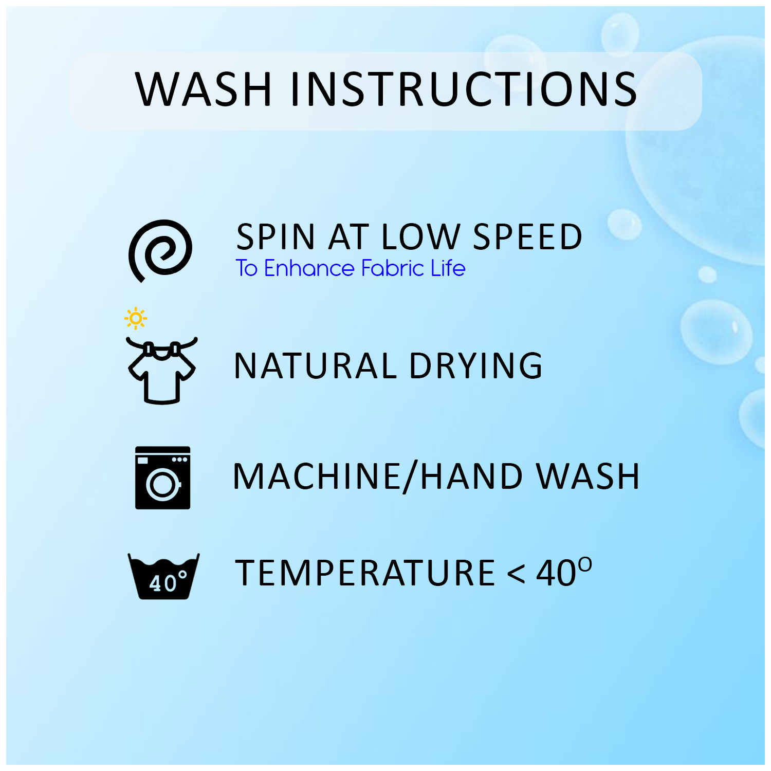 Hand wash or machine wash in cold water. Do not bleach. Tumble dry on low heat. Wash separately for the first time. Can be dried in mild sunlight.