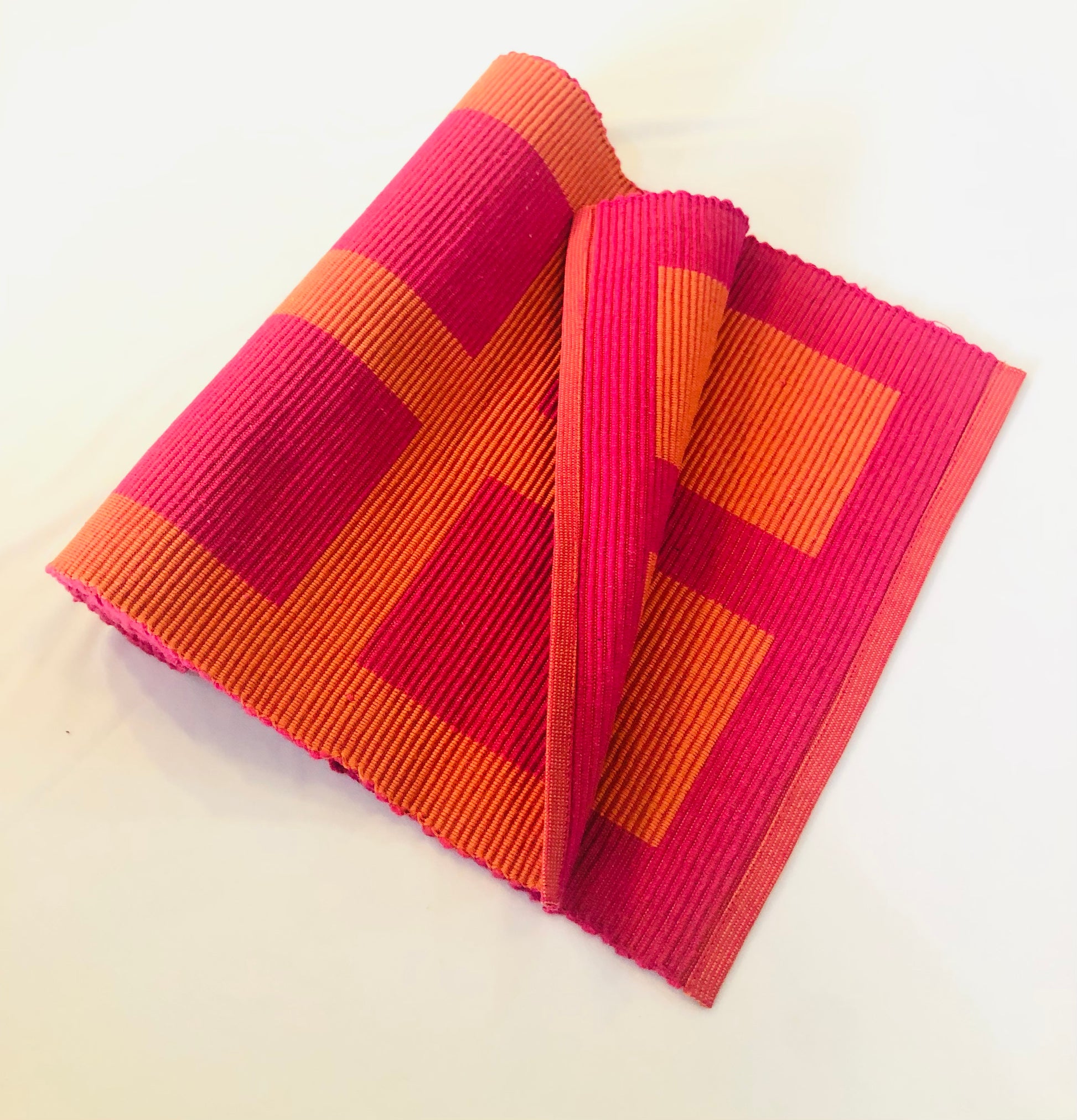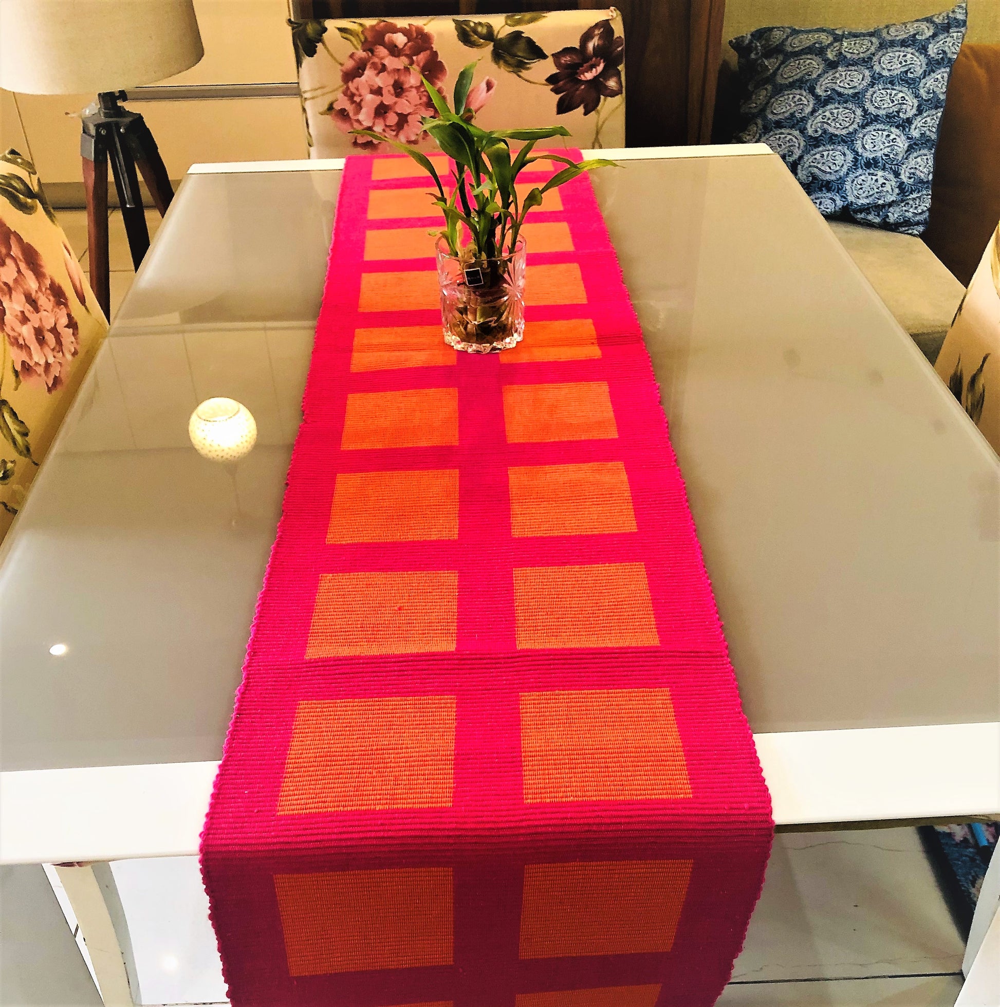 Rangbhar Handloom Ribbed Cotton Table Runner for Living/Dining Room/Home Decor, Anti Skid, Reversible, Machine Washable, 12 X 72 inches, Striped, Pink Orange Box